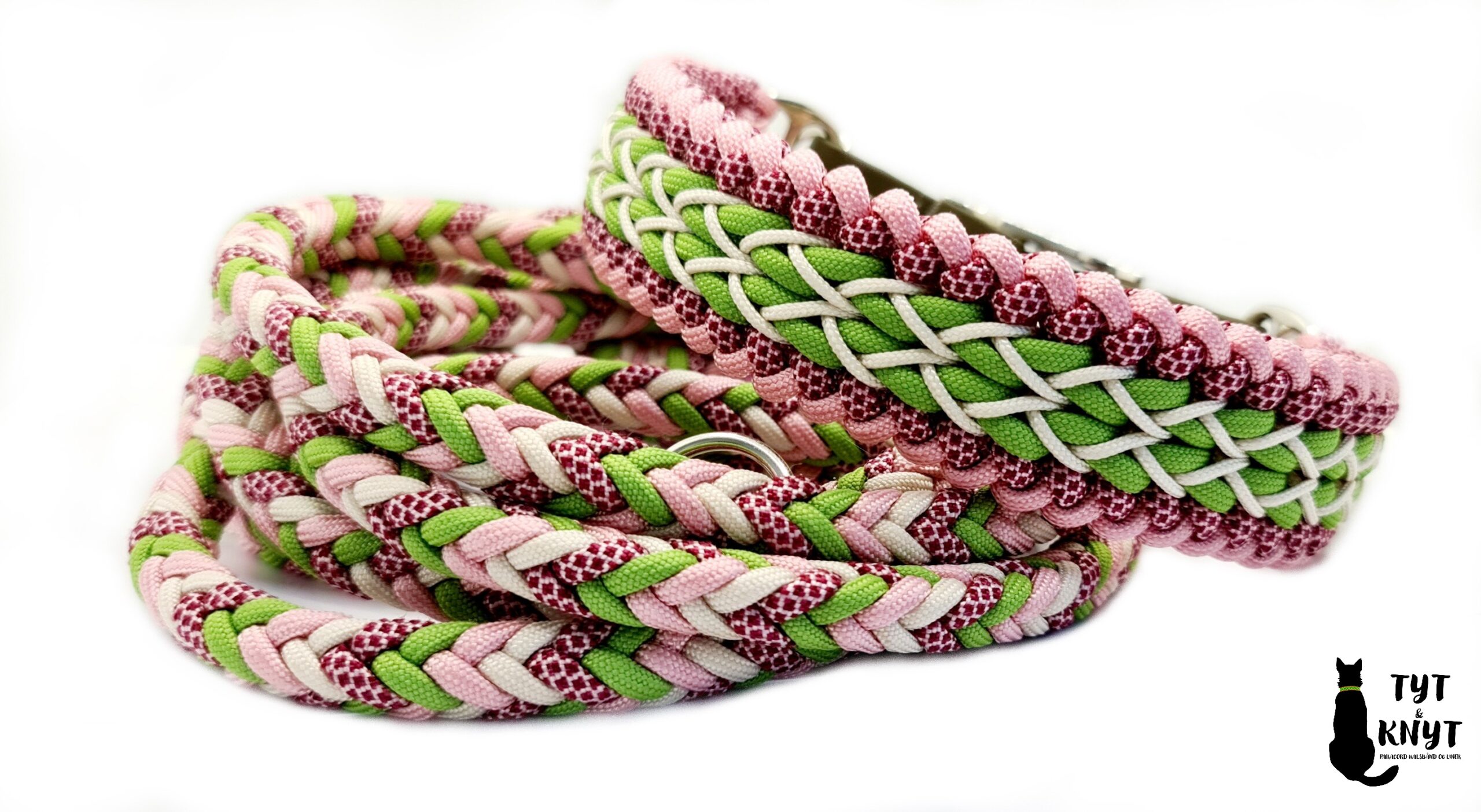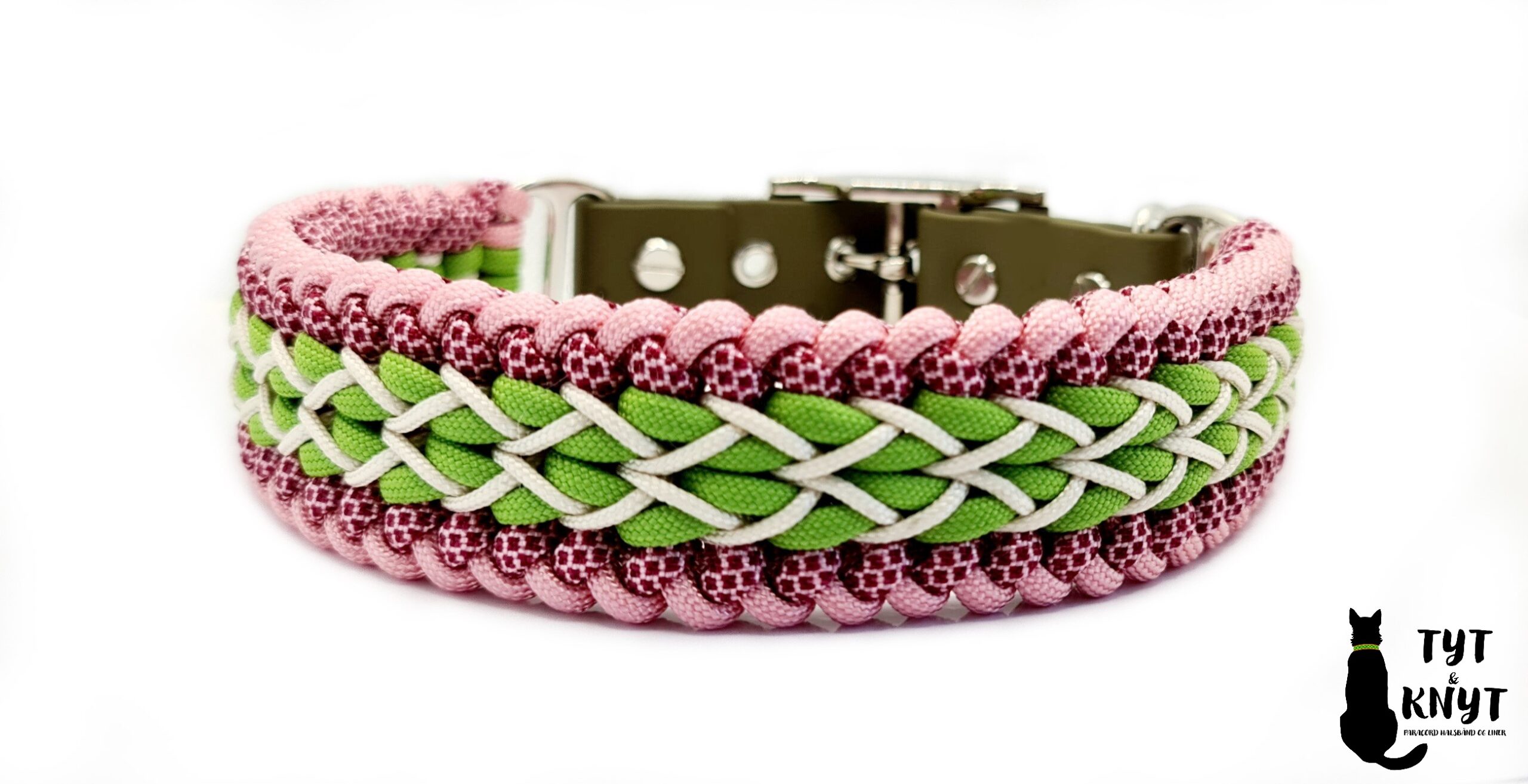 Smukt halsbånd flettet i paracord med justerbar del i biothane.