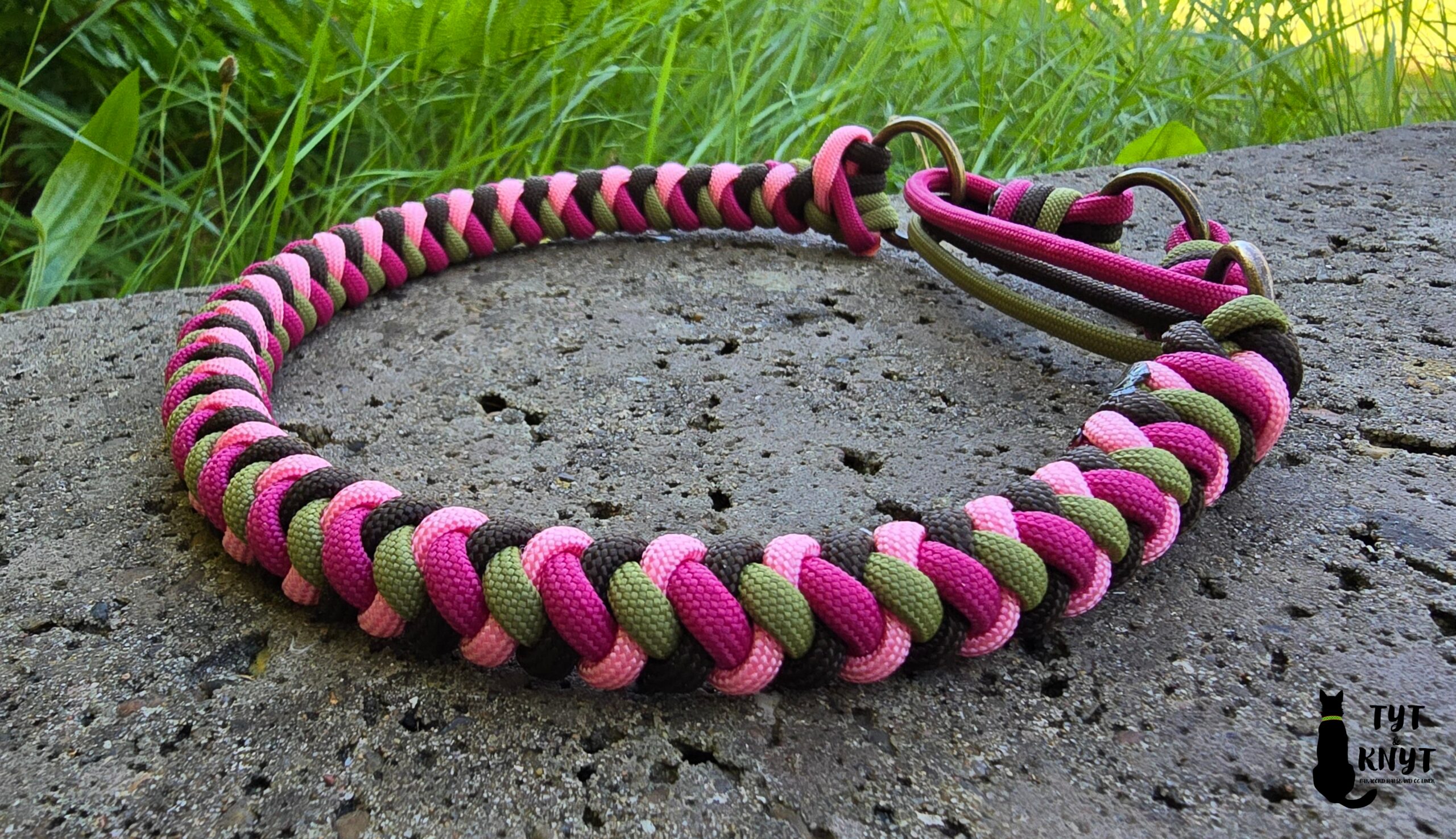 Rundtflettet halsbånd i paracord med martingale lukning.